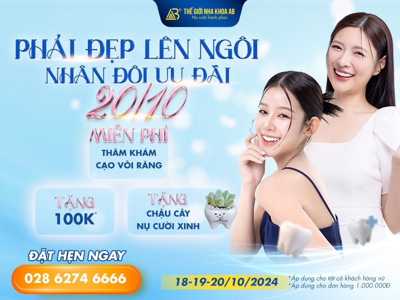 Nhân dịp chào mừng Ngày Phụ Nữ Việt Nam 20/10, Thế Giới Nha Khoa AB hân hạnh tổ chức chương trình PHÁI ĐẸP LÊN NGÔI – NHÂN ĐÔI ƯU ĐÃI. Đây không chỉ là lời tri ân đặc biệt dành tặng cho phái đẹp mà còn là cơ hội để chúng tôi nâng cao chất lượng dịch vụ và gắn kết với khách hàng. Với nhiều ưu đãi hấp dẫn, chương trình hứa hẹn mang đến những trải nghiệm tuyệt vời và sự chăm sóc tận tình nhất cho khách hàng nữ trong dịp đặc biệt này.